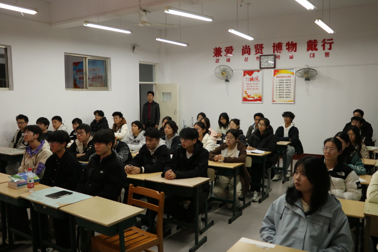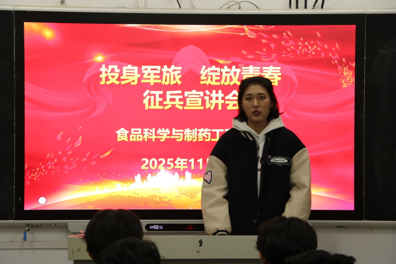 为厚植家国情怀,引导食药学子肩负起新时代强军使命,11月9日,食品科学与制药工程学院在文科楼举办征兵政策宣讲会。活动由专职辅导员张猛老师主持,2025级退役大学生士兵丁睿祺同学与怀揣军旅梦的同学们进行面对面交流。