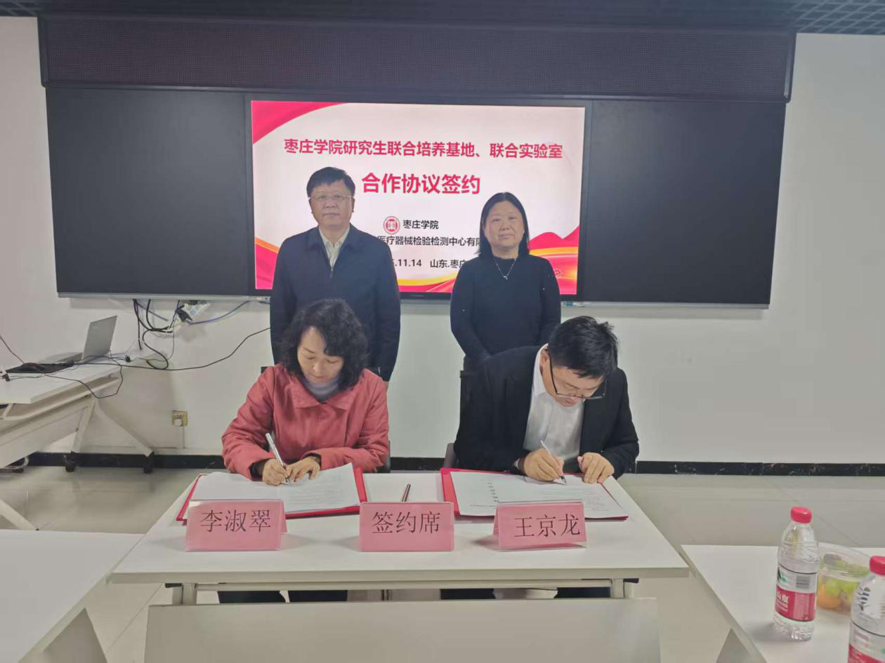 2025年11月14日下午,由枣庄学院与山东邦众医疗器械检验检测中心有限公司联合主办的“大健康产业学术沙龙暨枣庄学院研究生联合培养基地、联合实验室揭牌仪式”在枣庄高新区新医药产业园综合办公楼三楼会议室隆重举行。校党委委员、副校长李目海,山东邦众总经理李淑翠出席活动。我校食品科学与制药工程学院院长王京龙、健康工程技术研究院院长韦德泉和部分教师代表参加活动。