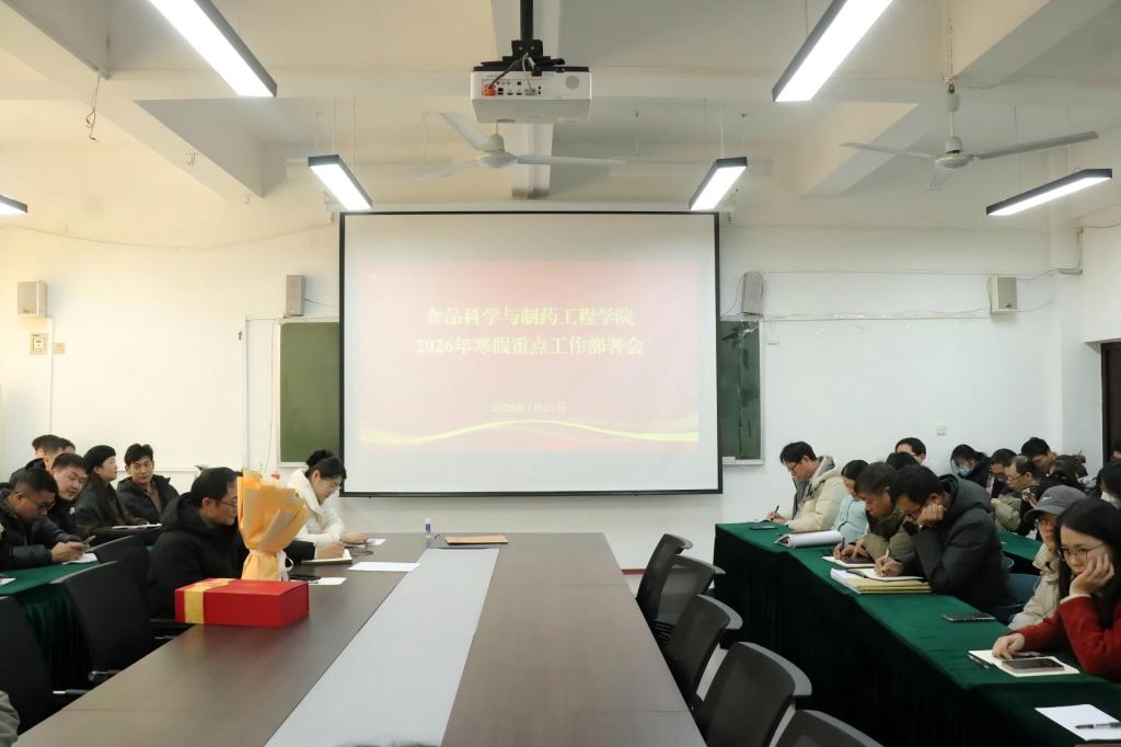 为统筹推进学院高质量发展,压实寒假期间重点工作责任,确保各项任务有序落地。1月21日上午,食品科学与制药工程学院2026年寒假重点工作部署会在文科楼213召开,学院全体教职工参加会议,院长王京龙主持会议。