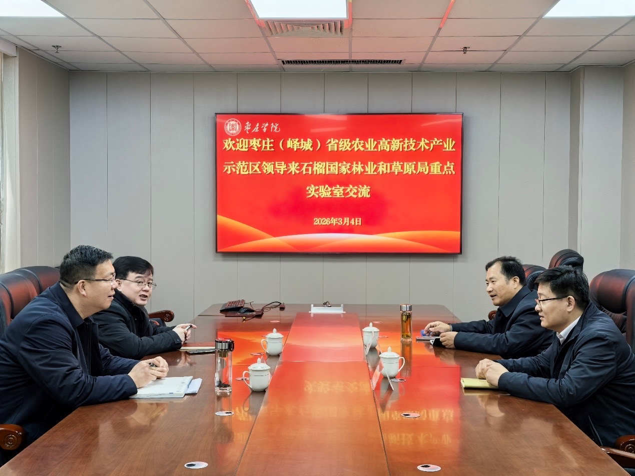 3月4日,枣庄(峄城)省级农业高新技术产业示范区管理委员会主任姜徐、办公室主任王洪涛一行来到我校薛城校区,访问石榴国家林业和草原局重点实验室,并举行合作交流座谈会。石榴国家林业和草原局重点实验室主任张立华,副主任、研究生处处长、食品科学与制药工程学院院长王京龙参加座谈。