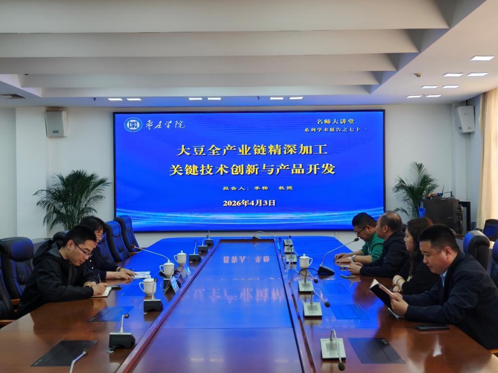 4月3日下午3点,我校“名师大讲堂”系列学术报告第七十一讲在市中校区综合楼三楼会议室成功举办。本次大讲堂特邀国家“万人计划”科技创新领军人才专家、吉林大学食品科学与工程学院李杨教授,作题为《大豆全产业链精深加工关键技术创新与产品开发》的专题学术报告。